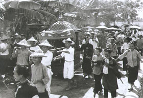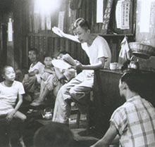 | Bilder von einer verschwundenen Welt [Bild] Dieses Bild lässt auf den ersten Blick gleich zwei Charakteristika der Hakka-Kultur von Meinung erkennen: die von Frauen getragenen Etuiblusen und die mit Wachspapier bespannten Sonnenschirme. Bauern tragen eine Brautsänfte durch ein Dorf mit traditionellen Häusern. Andere Bauern vor einem ähnlichen Gebäude beim Reisdreschen. Eine Straßenszene mit Fahrradrikschas. Diese und andere Bilder, die Yang Chi-hsin zwischen 1952 und 1959 an Orten auf der ganzen Insel Taiwan sowie auf Kinmen auf Zelluloid bannte, rufen bei älteren Betrachtern heute nostalgische Gefühle und Wehmut hervor, denn seit dem Beginn der rasanten Wirtschaftsentwicklung ab den sechziger Jahren hat Taiwan sich bis zur Unkenntlichkeit verändert. Der große Unterschied von damals zu heute lässt sich auch ohne Fotos schon an wenigen Zahlen ablesen. Damals hatte Taiwan 9 Millionen Einwohner, von denen 33 Prozent in der Landwirtschaft tätig waren. Heute leben auf der Insel 23 Millionen Menschen, doch der Anteil der Landwirtschaft am Bruttoinlandsprodukt beträgt keine drei Prozent mehr. Das jährliche durchschnittliche Pro-Kopf-Einkommen beträgt heute über 12 000 US$, zu jener Zeit waren es gerade mal 200 US$. "Die Menschen waren damals anspruchsloser als heute", erinnert Yang sich. "Der materielle Bedarf war nicht so groß. Allerdings herrschte bei aller Armut auch kein Hunger." Die fünfziger Jahre waren in Taiwan im Prinzip eine Phase der Ruhe nach dem Sturm. 1945 war in Taiwan die 50-jährige japanische Kolonialzeit zu Ende gegangen. Die Japaner hatten Taiwan autoritär regiert, aber andererseits die Insel wegen ihrer Bedeutung für Japans Expansion nach Südasien im Zweiten Weltkrieg industriell und infrastrukturell entwickelt. So war Taiwan zwar moderner als das chinesische Festland, doch ein Teil der Ressourcen wurde durch alliierte Bombardements kurz vor Kriegsende beschädigt, und der Rest wurde nach der Rückgabe Taiwans an China von der KMT-Regierung für den Bürgerkrieg gegen die chinesischen Kommunisten nutzbar gemacht. Der chinesische Bürgerkrieg endete bekanntlich mit der Niederlage der Nationalisten und ihrem Rückzug nach Taiwan 1949. Mit dem Beginn des Koreakrieges 1950 wuchs Taiwans Bedeutung für die USA als antikommunistisches Bollwerk, und so schickte Washington Truppen, Material, logistische Hilfe und Geld zu der Insel. Ein Teilbereich der amerikanischen Entwicklungshilfe für Taiwan war die Landwirtschaft. Die Arbeit der landwirtschaftlichen Entwicklung wurde von der "Gemeinsamen Kommission für ländlichen Wiederaufbau" ( Joint Commission on Rural Reconstruction, JCRR) geleitet. Die JCRR setzte sich aus amerikanischen und chinesischen Mitgliedern zusammen, doch ihre Finanzierung kam komplett aus den USA. Die Aufbauarbeit der JCRR wurde ausgiebig mit Fotografien dokumentiert, und zu diesem Zweck hatte die Behörde Yang Chi-hsin unter Vertrag genommen. Dabei war Yang eigentlich kein Profi-Fotograf. 1923 als Sohn einer Grundbesitzerfamilie in Chingshui (Kreis Taichung) geboren, kam Yang als Fünfjähriger mit seinen Eltern nach Japan und lebte dort die folgenden zwanzig Jahre. In Japan durchlief er seine gesamte Schulbildung, einschließlich ein Studium der Anglistik und Geschichte an der Sophia University in Tokyo ab 1942. Als Yang in sein Geburtsland zurückkehrte, war es eine Reise in ein Land, das ihm fremd war und dessen Sprache er längst nicht so gut beherrschte wie Japanisch. Bis heute ist für Yang die erste Sprache Japanisch, sein Chinesisch bewertet er selbst als nicht besser als sein Englisch. Seine Fremdsprachenkenntnisse kamen Yang in Taiwan indes sehr gelegen. Zunächst arbeitete er gut zwei Jahre als Englischlehrer an einer Mittelschule in seiner Heimatstadt Chingshui. Danach wurde er von der Zeitschrift Harvest ("Ernte-Magazin") wegen seiner Japanischkenntnisse engagiert. " Harvest war eine chinesischsprachige Zeitschrift für Bauern und die Menschen auf dem Lande", erzählt Yang. "Doch so kurz nach dem Krieg konnten viele Bauern, die im japanischen Bildungssystem erzogen worden waren, kein Chinesisch lesen, daher brauchte das Magazin jemanden, der eine Zusammenfassung der Artikel ins Japanische übersetzte." Fotografieren hatte Yang schon als Schüler und Student in Japan als Hobby betrieben, jedoch nie eine professionelle Ausbildung darin erhalten. Immerhin beherrschte er das Entwickeln von Schwarzweiß-Filmen und war mit den erforderlichen Verfahren in einer Dunkelkammer vertraut. "Japan war damals im Bereich Fotografie weiter entwickelt als Taiwan", verrät er. Als seine Kollegen vom Harvest-Magazin von ihm geknipste Bilder sahen, fragten sie ihn, ob er nicht auch Fotos für die Zeitschrift aufnehmen wolle. Yang willigte natürlich ein. [Bild] Bauern beim Reisdreschen in Hsiaying, Kreis Tainan. In Taiwans modernisierter Landwirtschaft bekommt man solche Szenen heute nicht mehr zu Gesicht. [1953] In der Folgezeit erschienen immer wieder Fotos von Yang in Harvest, auch auf der Titelseite. Da Harvest unter anderem von der JCRR gesponsort wurde, wurden die Amerikaner schnell auf ihn aufmerksam. Die Qualität von Yangs Bildern beeindruckte die JCRR so sehr, dass sie ihn bald als festen Mitarbeiter von Harvest abwarb. Insgesamt war Yang rund zehn Jahre für Harvest und die JCRR tätig. "Das war für mich die glücklichste und sorgenfreieste Zeit meines Lebens", schwärmt er. Yang erhielt ein anständiges Gehalt in US$ und wurde zudem von der Behörde mit erstklassigen Kameras wie Leica oder Rolleiflex versorgt. Langeweile kam bei dem Job ebenfalls nicht auf, die Dokumentierungsarbeit für die JCRR führte Yang in fast jeden Winkel der Insel. Diese Fahrten waren für ihn, von der Sozialisierung her eher ein Japaner als ein Taiwaner, eine Entdeckungsreise zu den eigenen Wurzeln. In diesen Jahren schoss Yang um die 10 000 Fotos, zum Teil auch in Farbe. Die überwiegende Mehrzahl der Bilder diente der Dokumentierung von landwirtschaftlic
